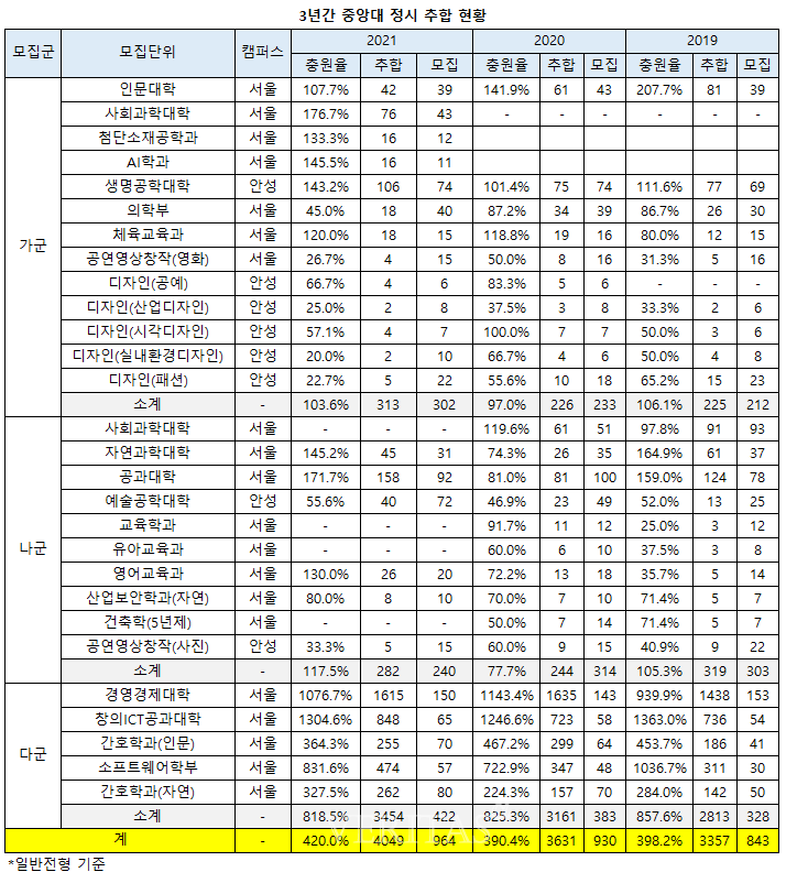 Áß´ë ´Ù±º¿¡¼ Ãæ¿øÀ²ÀÌ °¡Àå ³ôÀº Çаú´Â °æ¿µ°æÁ¦´ëÇÐÀÌ´Ù. 150¸í ¸ðÁý¿¡ 1615¸íÀÌ ÃßÇÕÇØ 1076.7%¸¦ ±â·ÏÇß´Ù. À̾î âÀÇICT°ø°ú´ëÇÐÀÌ 1304.6%(848¸í/65¸í)·Î 10¹ÙÄû¸¦ ³Ñ´Â Ãæ¿øÀ²ÀÌ´Ù. ÀÌ¾î °£È£Çаú(Àι®) 364.3%(255¸í/70¸í), ¼ÒÇÁÆ®¿þ¾îÇкΠ831.6%(474¸í/57¸í), °£È£Çаú(ÀÚ¿¬) 327.5%(262¸í/80¸í) ¼øÀÌ´Ù.