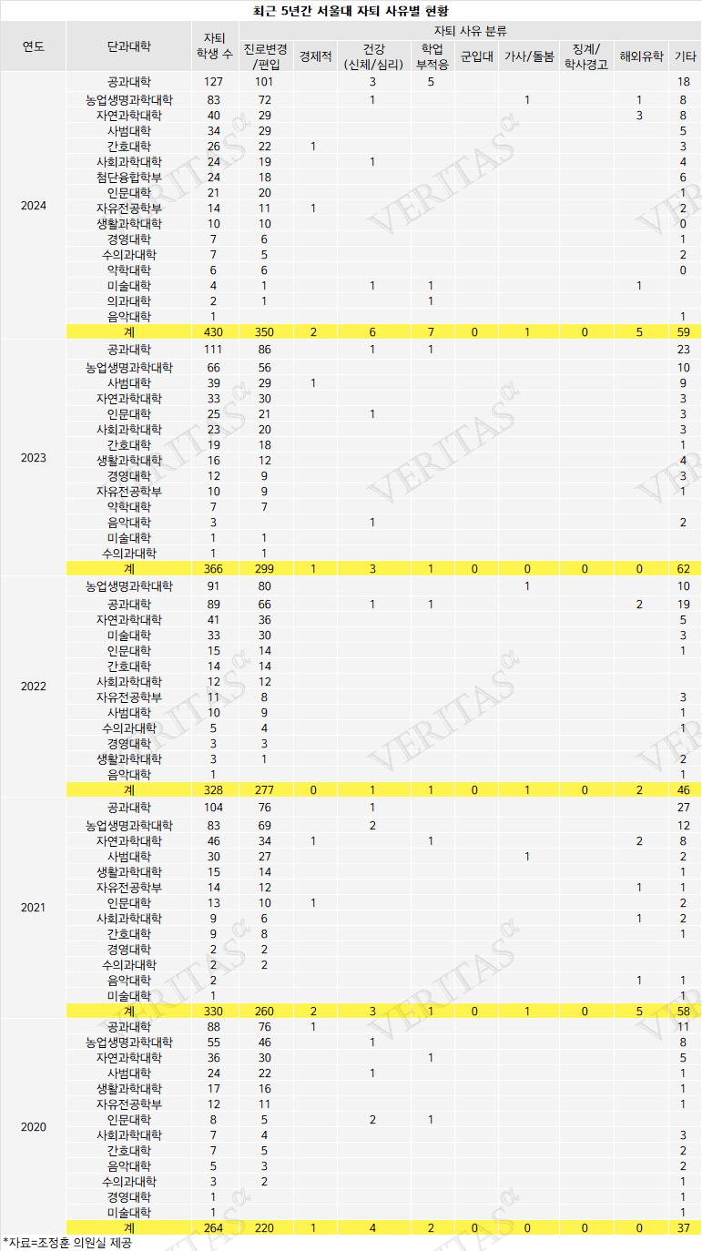 Áö³ÇØ ¼¿ï´ë ÀÚÅð»ýÀÌ 430¸íÀ¸·Î 11³â·¡ ÃÖ´ëÄ¡¸¦ ±â·ÏÇß´Ù. ±¹È¸ ±³À°À§¿øÈ¸ ¼Ò¼Ó Á¶Á¤ÈÆ(±¹¹ÎÀÇÈû) ÀÇ¿ø½ÇÀÌ ±³À°ºÎ·ÎºÎÅÍ ¹ÞÀº '±¹¸³´ë ÀÚÅð ÇöȲ' ÀÚ·á¿¡ µû¸£¸é Áö³ÇØ ¼¿ï´ë¿¡¼ ÃÑ 430¸íÀÌ ÀÚÅðÇß´Ù. 2014³â 234¸í, 2015³â 158¸í, 2016³â 182¸í, 2017³â 163¸í, 2018³â 217¸í, 2019³â 193¸í, 2020³â 264¸í, 2021³â 330¸í, 2022³â 328¸í, 2023³â 366¸í, 2024³â 430¸íÀÇ ÃßÀÌ´Ù.
