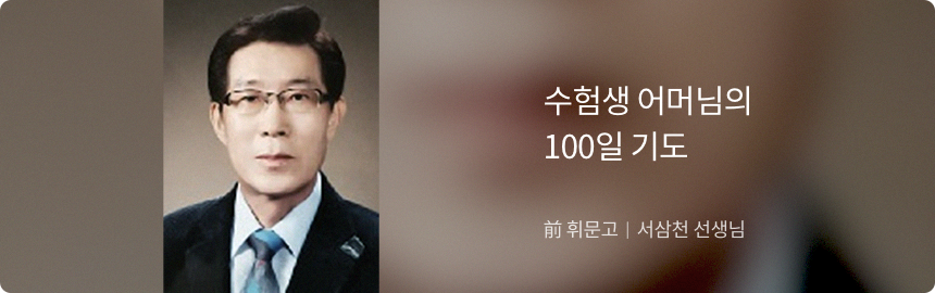 ±×·¡¼ 100ÀÏ ±âµµ¸¦ °èȹÇϽðųª Á¡ÁýÀ» ãÀ¸·Á´Â ¾î¸Ó´Ôµé¿¡°Ô ºÎŹÇÏ°í ½Í´Ù. ¹°·Ð ¾î¸Ó´ÔÀÇ Á¤¼º°ú ±â¿øÀÌ ´ã±ä 100ÀÏ ±âµµ¸¦ Å¿Çϰųª À߸øÀ̶ó°í »ý°¢ÇÏÁö´Â ¾Ê´Â´Ù. ÇÏÁö¸¸ ±×Àü¿¡ ¾ÆÀÌÀÇ ¼ºÀå °úÁ¤¿¡¼ °üÂûÇÏ°í ´À²¼´ø ¾ÆÀÌÀÇ Àû¼º°ú Àç´É°ú ´É·ÂÀº ÃæºÐÈ÷ »ý°¢ÇÏ°í °í¹ÎÇß´ÂÁö? ¾ÆÀÌÀÇ ¹Ì·¡ »ýȰ¿¡ ´ëÇØ¼ ÁøÁöÇÏ°Ô ¾ÆÀÌ¿Í Åä·ÐÀº Çß´ÂÁö? ¾ÆÀÌÀÇ °Ç°°ú ¼·»ýÀº Àß Ã¬±â°í ÀÖ´ÂÁö? ½ÃÇè ´çÀϱîÁöÀÇ »ýȰ ½ºÄÉÁÙÀº Àß Â¥ µÎ¾ú´ÂÁö? ¾ÆÀ̺¸´Ù´Â ÁÖº¯¿¡ °ú½ÃÇÏ°í ½ÍÀº ºÎ¸ðÀÇ ¿å½ÉÀº ¾ø´ÂÁö? µîÀ» ÁøÁöÇÏ°Ô °ËÅäÇÏ°í °í¹ÎÇÏ´Â ½Ã°£À» °®±â¸¦ ±ÇÀåÇÑ´Ù. ¿ÀÈ÷·Á Çб³ÀÇ ´ãÀÓ ¼±»ý´ÔÀ̳ª ÁøÇдã´ç ¼±»ý´Ô, ÀԽà Àü¹® ±³À°»ó´ã°¡¿Í ÁøÁöÇÏ°Ô »óÀÇÇÏ°í °áÁ¤Çϱ⸦ ±ÇÇÑ´Ù.