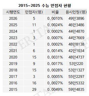 [º£¸®Å¸½º¾ËÆÄ=½ÅÇöÁö ±âÀÚ] ü°¨³µµ°¡ ³ô¾Æ °ÅÀÇ ¿ª´ë±Þ¿¡ °¡±î¿î ºÒ¼ö´É¿¡µµ ºÒ±¸Çϰí 2026¼ö´É ¸¸Á¡ÀÚ´Â 5¸íÀÌ´Ù. 4ÀÏ Æò°¡¿øÀÌ ¹àÈù ¼ö´É ¸¸Á¡ÀÚ´Â ÀçÇлý 4¸í, Á¹¾÷»ý 1¸íÀ¸·Î ÃÑ 5¸íÀÌ´Ù. ÆòÀÌÇß´ø Áö³ÇØ ¼ö´ÉÀÇ 11¸í°ú ºñ±³ÇØ Àý¹Ý ¼öÁØÀ¸·Î ÁÙ¾ú´Ù. ÇöÀç±îÁö ÆÄ¾ÇµÈ ¸¸Á¡ÀÚ 5¸í Áß ÀÚ¿¬°è°¡ 4¸í, Àι®°è°¡ 1¸íÀÎ »óȲ. ƯÈ÷ ¿ÃÇØ »çŽÀÌ ¾î·Æ°Ô ÃâÁ¦µÅ ¼ö´É¸¸Á¡ÀÚ °¡¿îµ¥ Ç¥Á¡ ÃÖ°íÁ¡ÀÚ´Â ¿ª´ë óÀ½À¸·Î Àι®°è¿¡¼ ³ª¿Ã °¡´É¼ºÀÌ Å©´Ù.