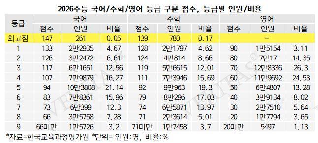 ¼öÇÐÀº ÃÖ»óÀ§±Ç ü°¨ ³À̵µ »ó½ÂÇß´Ù. Ç¥Á¡ ÃÖ°íÁ¡Àº 139Á¡À¸·Î Áö³ÇØ 140Á¡º¸´Ù 1Á¡ Ç϶ôÇßÁö¸¸, Ç¥Á¡ ÃÖ°íÁ¡ÀÚ´Â 780¸í(0.17%)À¸·Î Áö³ÇØ 1522¸í(0.34%)º¸´Ù °¨¼ÒÇß´Ù. ±è ½ÇÀåÀº ¡°Ç¥Á¡ ÃÖ°íÁ¡¸¸ º¸¸é ºñ½ÁÇÑ ¼öÁØÀ¸·Î ÃâÁ¦µÈ °ÍÀ¸·Î º¸ÀÏ ¼ö ÀÖÁö¸¸, ½ÇÁ¦ 1µî±Þ ³»ÀÇ ±Þ°£º° Àοø°ú ´©Àû ºÐÆ÷°¡ °¨¼ÒÇØ ÃÖ»óÀ§±Ç ü°¨ ³À̵µ´Â ³ô¾Ò´ø ½ÃÇèÀ¸·Î Æò°¡µÈ´Ù¡±°í ¼³¸íÇß´Ù.