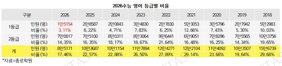 ³í¶õÀÎ ¿µ¾îÀÇ °æ¿ì ¿ª´ë±ÞÀ¸·Î ¾î·Æ°Ô ÃâÁ¦µÇ¸ç Àý´ëÆò°¡ÀÓ¿¡µµ »ó´çÇÑ ¿µÇâ·ÂÀ» Çà»çÇÒ °ÍÀ¸·Î º¸ÀδÙ. ¿ÃÇØ ¿µ¾î 1µî±Þ ºñÀ²Àº 3.11%(1¸¸5154¸í)À¸·Î Áö³ÇØ 6.22%(2¸¸8587¸í)ÀÇ Àý¹Ý °¡±îÀÌ °¨¼ÒÇß´Ù. ÀÌ´Â 2018Çг⠿µ¾î Àý´ëÆò°¡ »Ó ¾Æ´Ï¶ó 1994Çг⠼ö´É µµÀÔ ÀÌÈÄ 1µî±Þ ºñÀ²·Î´Â ¿ª´ë ÃÖÀúÄ¡´Ù. Á¾·ÎÇпøÀÇ ºÐ¼®¿¡ µû¸£¸é, Àý´ëÆò°¡ ÀÌÈÄ ¿µ¾î 1µî±Þ ºñÀ²Àº 2018Çгâ 10.03%, 2019Çгâ 5.30%, 2020Çгâ 7.43%, 2021Çг⵵ 12.66%, 2022Çгâ 6.25%, 2023Çгâ 7.83%, 2024Çгâ 4.71%, 2025Çгâ 6.22%À¸·Î ÃÖÀú 4%´ë¿¡¼ ÃÖ°í 12%´ë¸¦ ±â·ÏÇßÁö¸¸ ¿ÃÇØ óÀ½À¸·Î 3%´ë¸¦ ±â·ÏÇÑ ¼ÀÀÌ´Ù. ƯÈ÷ Àý´ëÆò°¡ °ú¸ñÀÓ¿¡µµ ºÒ±¸Çϰí ü°¨ ³À̵µ°¡ Å©°Ô ³ô¾ÆÁö¸é¼ Á¤½ÃÁö¿ø ½Ã ½ÇÁúÀû ¿µÇâ·ÂÀÌ Ä¿Áú °ÍÀ¸·Î º¸ÀδÙ. ÀÓ¼ºÈ£ Á¾·ÎÇпø ´ëÇ¥´Â ¡°¼ö´É ¸ðµç ¿µ¿ª¿¡¼ »ç»ó ÃÖ°í ºÒ¼ö´ÉÀ¸·Î Æò°¡µÇ´Â ¿µ¾î°¡ ¼ö½Ã/Á¤½Ã ¸ðµÎ ÇÙ½É º¯¼ö·Î ºÎ»óµÈ »óȲÀÌ´Ù. ƯÈ÷ ÇÑ ¹øµµ °æÇèÇØº¸Áö ¸øÇÑ ÀԽûóȲÀ̹ǷΠ¿¹ÃøºÒ°¡´É¼ºÀÌ Ä¿Á³´Ù¡±°í ¼³¸íÇß´Ù.